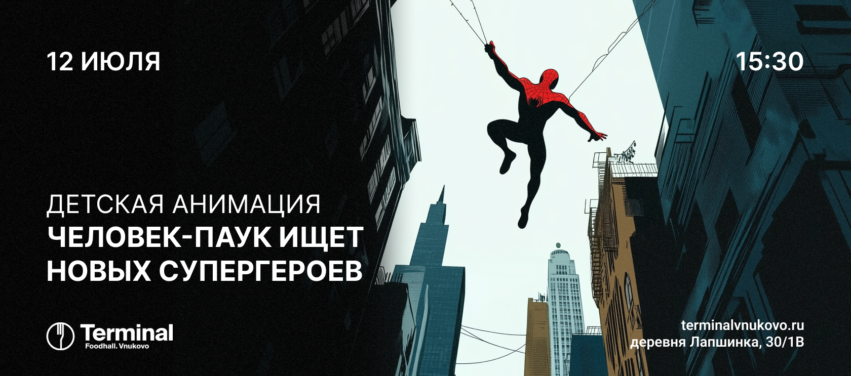 Детская анимация — Человек-Паук ищет новых героев — это увлекательное приключение с любимым персонажем. Terminal Foodhall Vnukovo превратится в настоящий супергеройский штаб, где каждый почувствует себя частью команды!